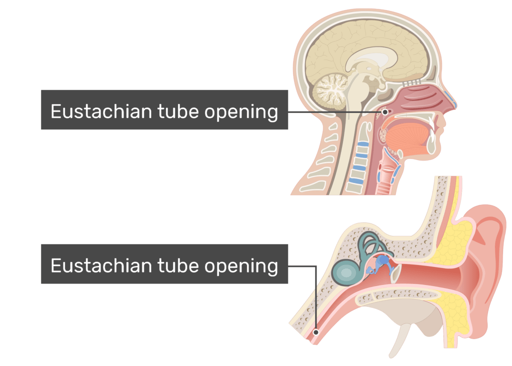 The Eustachian Tube pressurizes by pumping air through the tube, and to aid in equalizing the pressure in the Eustachian Tube, you can help by opening up the Eustachian Tube. Remember that the Eustachian Tube connects the middle ear to the throat. Since the tube connects to your throat, you just have to open your jaws and perform a chewing motion to pump air through the Eustachian Tube through your throat. This is why yawning, chewing gum, or swallowing can sometimes help your ears pop faster—these actions help open the Eustachian tube.
